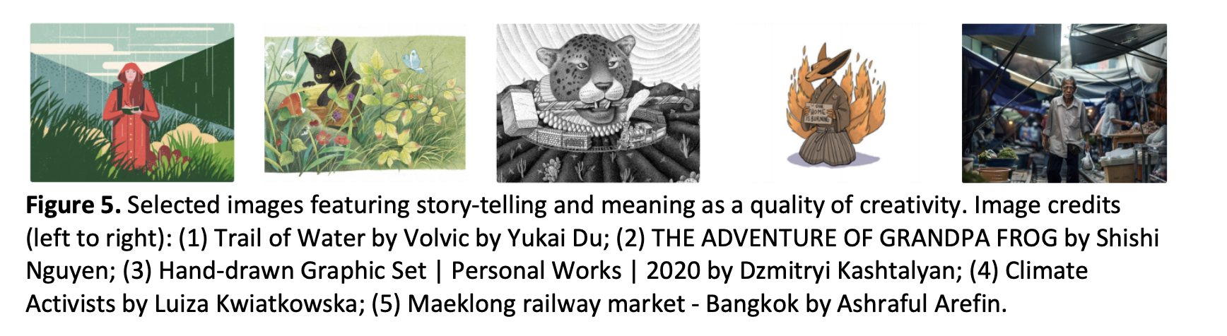 The qualitative results reveal that viewers define creative works as those that are novel, visually appealing, meaningful, and attention-grabbing. The drawing of attention appears to indicate creative success specifically in the digital realm, where an onslaught of visual content necessitates enhanced saliency. Indeed, as has been well-documented, social media’s business model produces an "attention economy," in which platforms vie for users’ attention in order to claim profitable views, clicks, etc. This has caused users to expect evermore salient content; in order to remain competitive, social websites have rewarded and prioritized attention-grabbing content. Such prioritization occurs by way of proprietary algorithms that take user behavior as input and optimize for human attention. This prioritization reinforces users’ expectations for more and more attention-grabbing content in online environments, and this may have caused the overvaluation of eye-catching pieces in my study. If users have a strongly-developed habit of scrolling mindlessly through an endless array of content until a piece catches their eye, they may automatically use that tactic to scope creative content as well. It’s also worth considering the online meta-performance of engaging with creative content via social websites, signaling to one’s network that one is both culturally-informed and artistically-aware in a Bordieuan fashion. Here, the tension between self-curation (a la Goffman) and algorithmic curation (a la Hogan) is brought into relief.